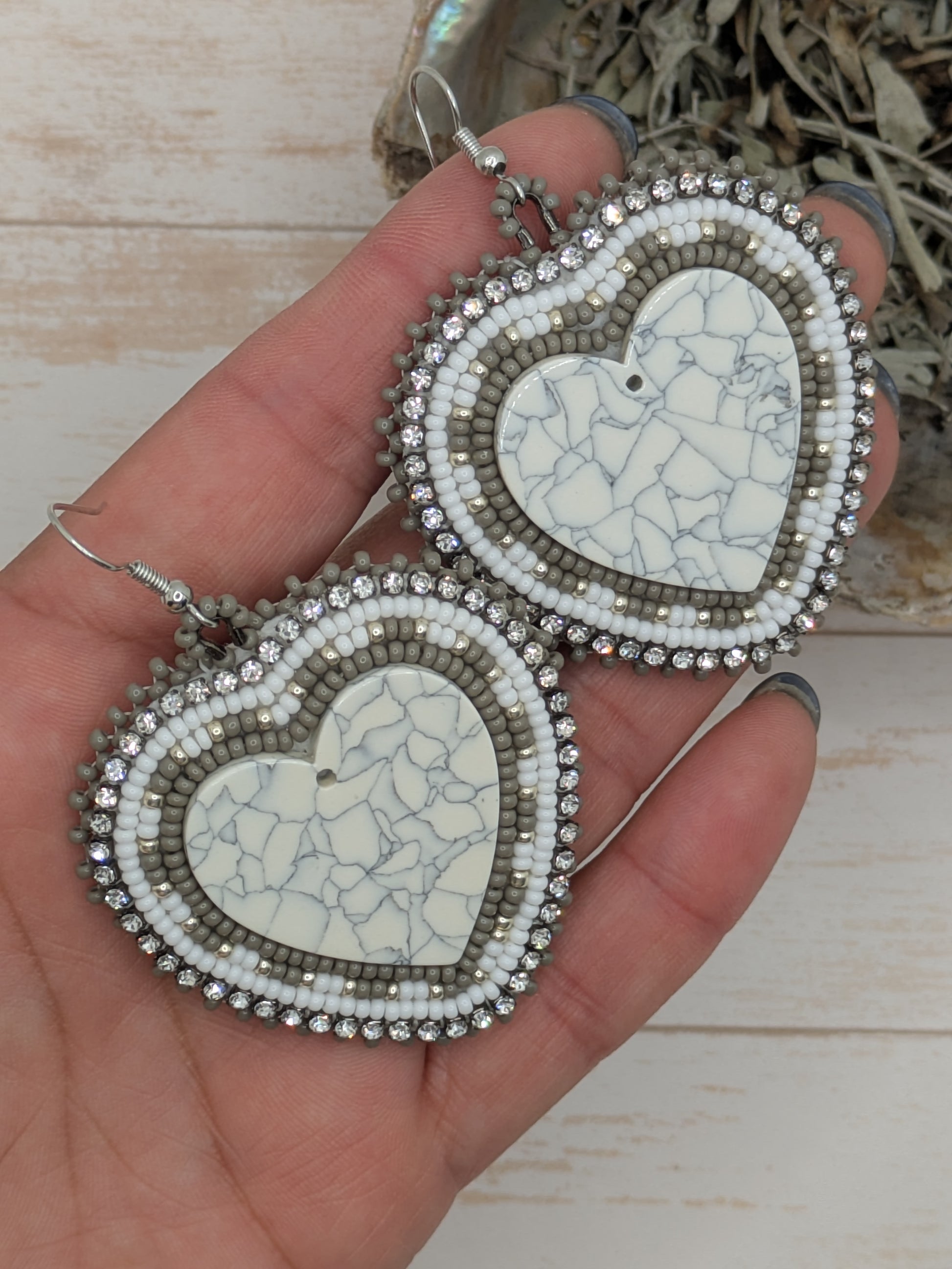 These earrings are beaded with size 11 seed beads and rhinestone banding. With faux leather backing.