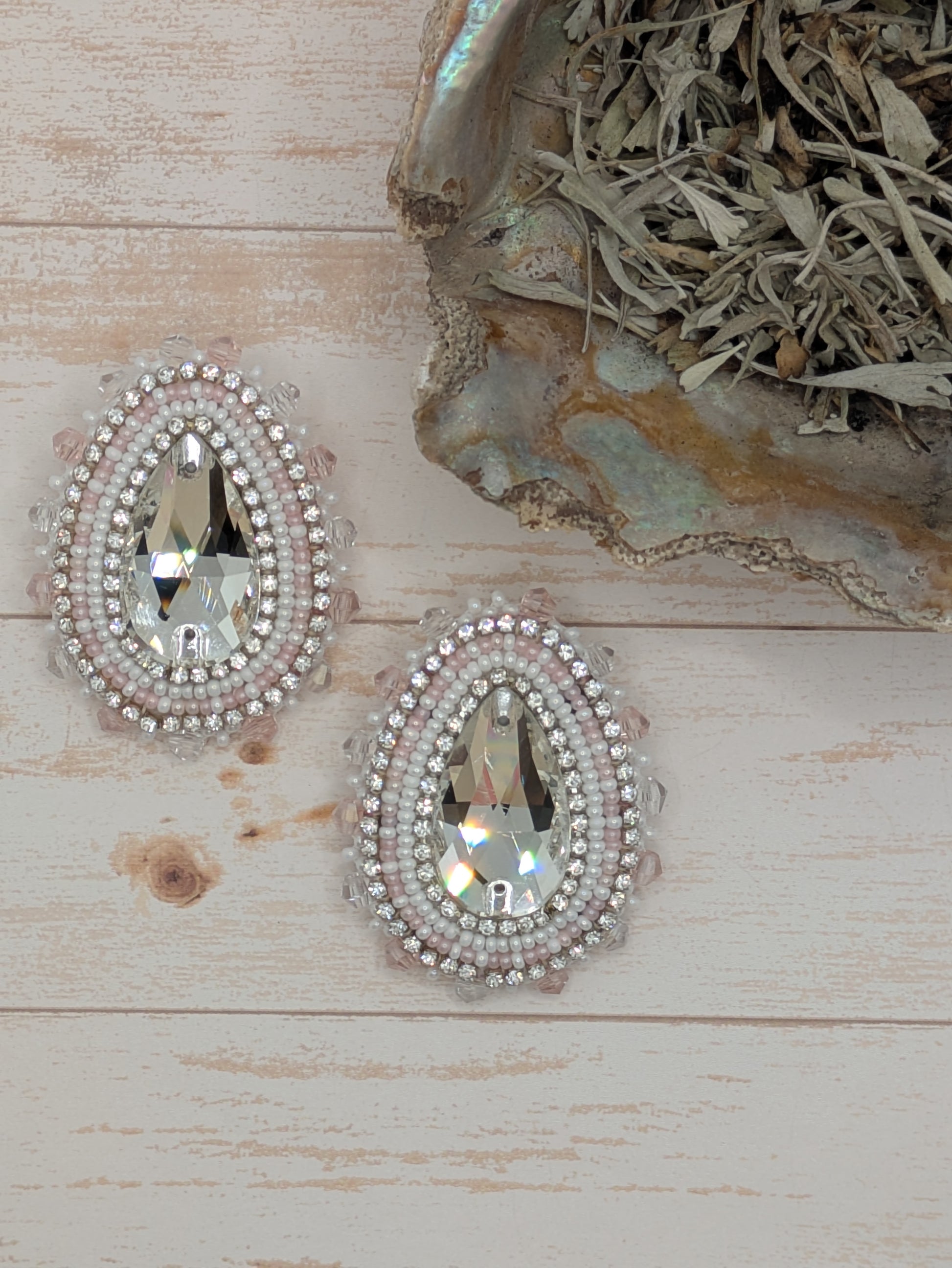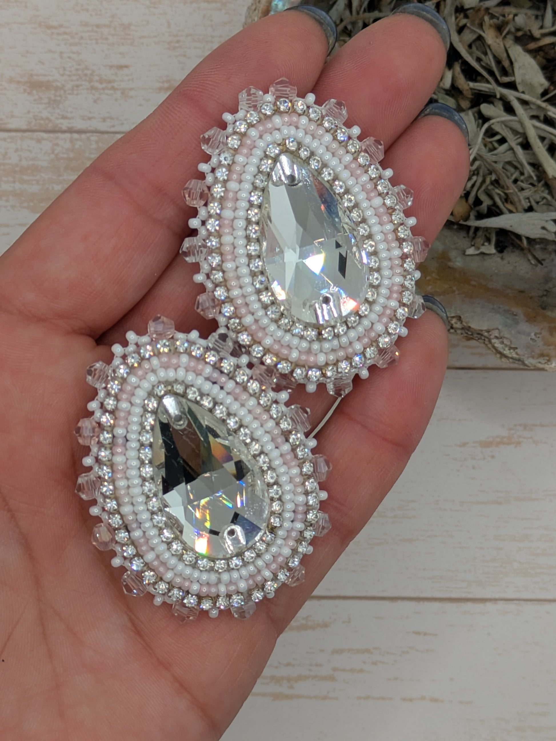 These earrings are beaded with two needle stye size 11 seed beads with rhinestone banding around a stunning K9 crystal.