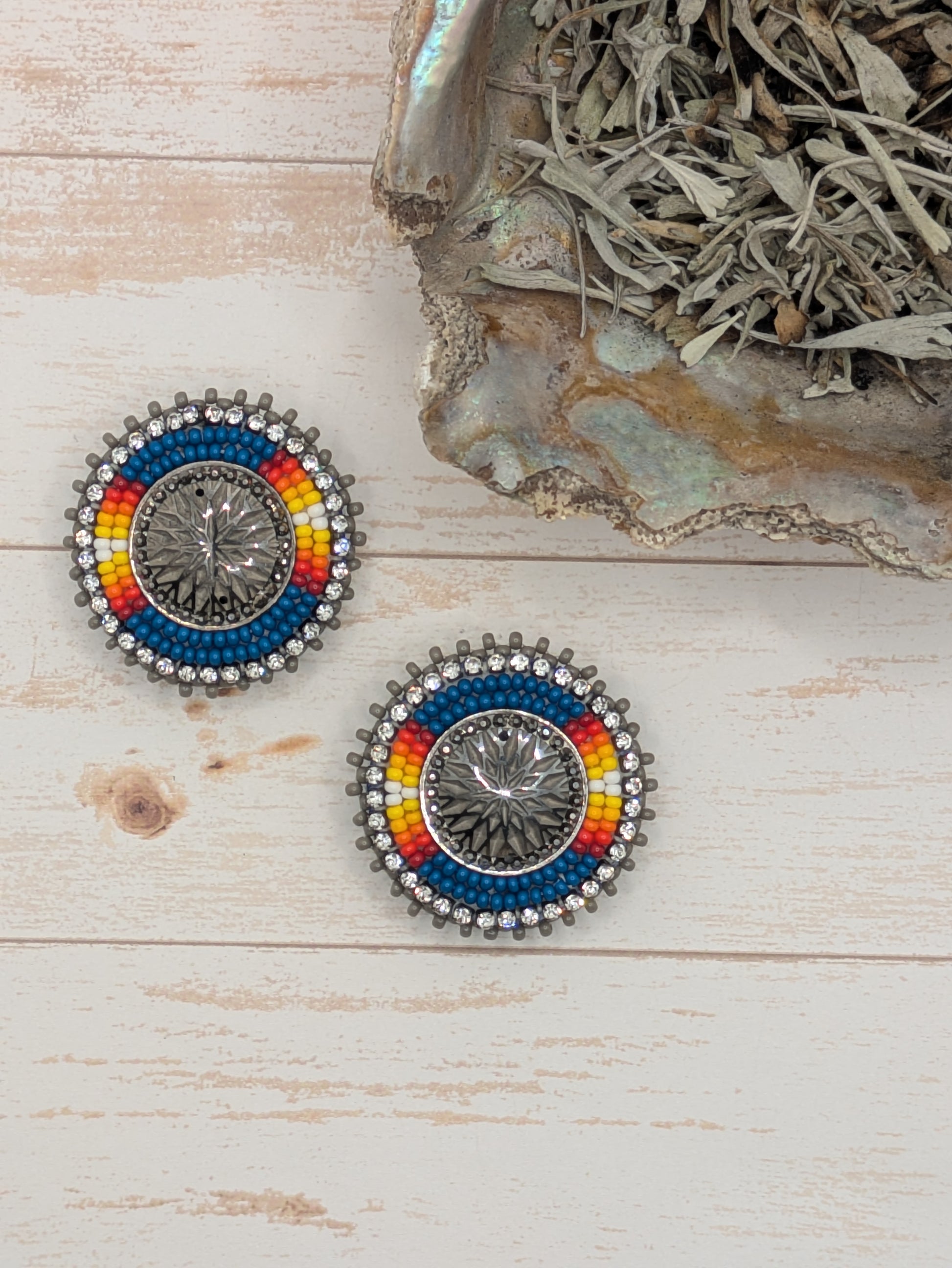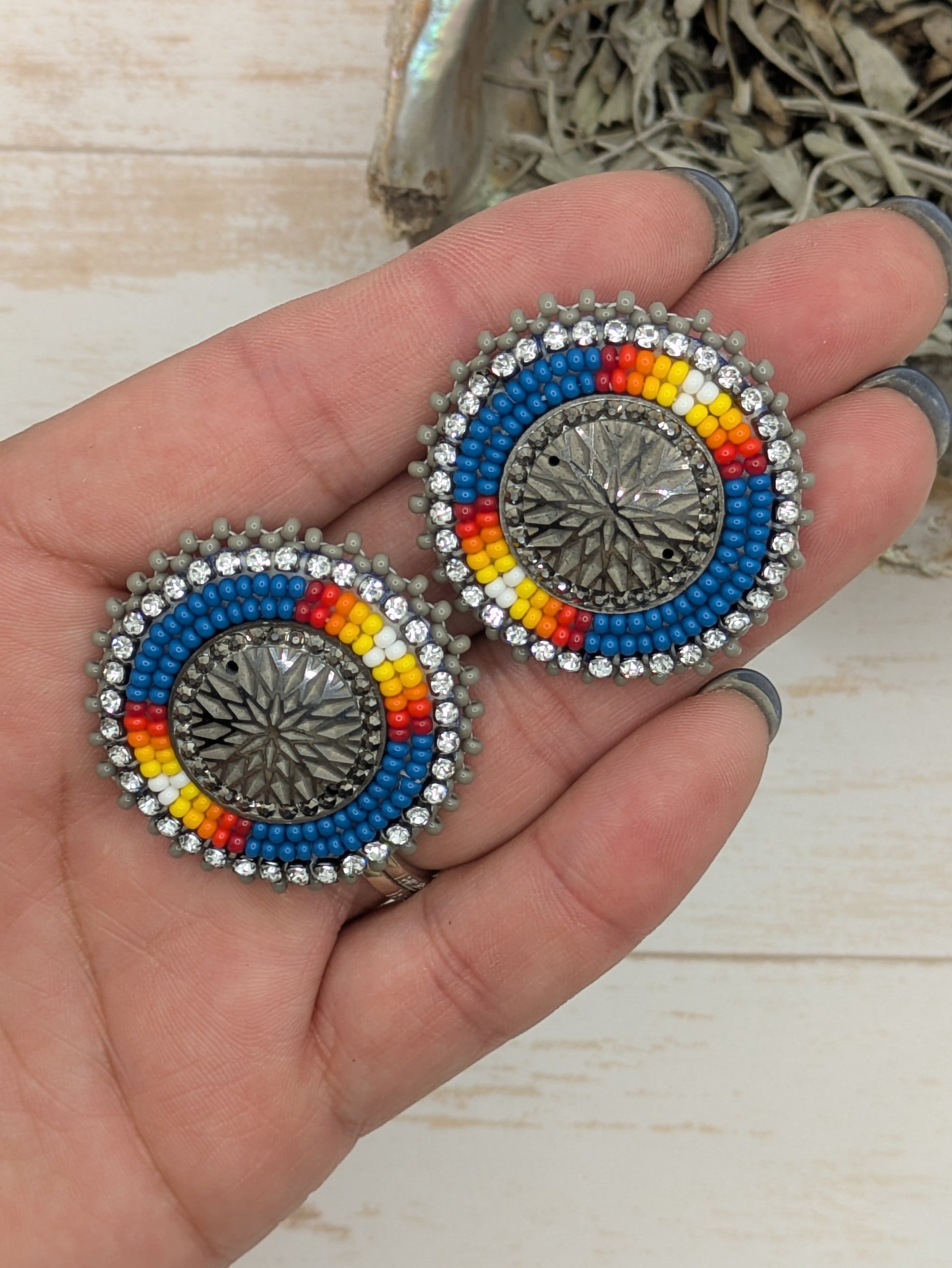 These earrings are beaded with two needle stye size 11 seed beads with rhinestone banding.