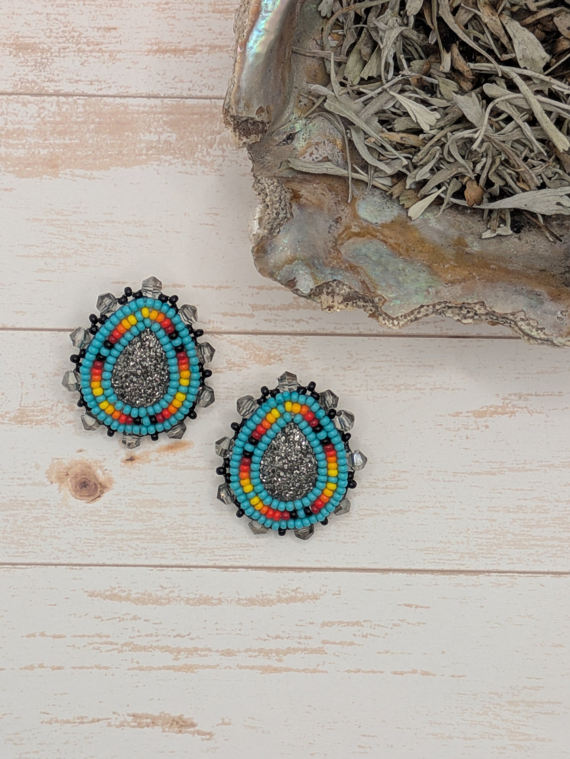 These earrings are beaded with two needle stye size 11 seed beads with rhinestone banding.