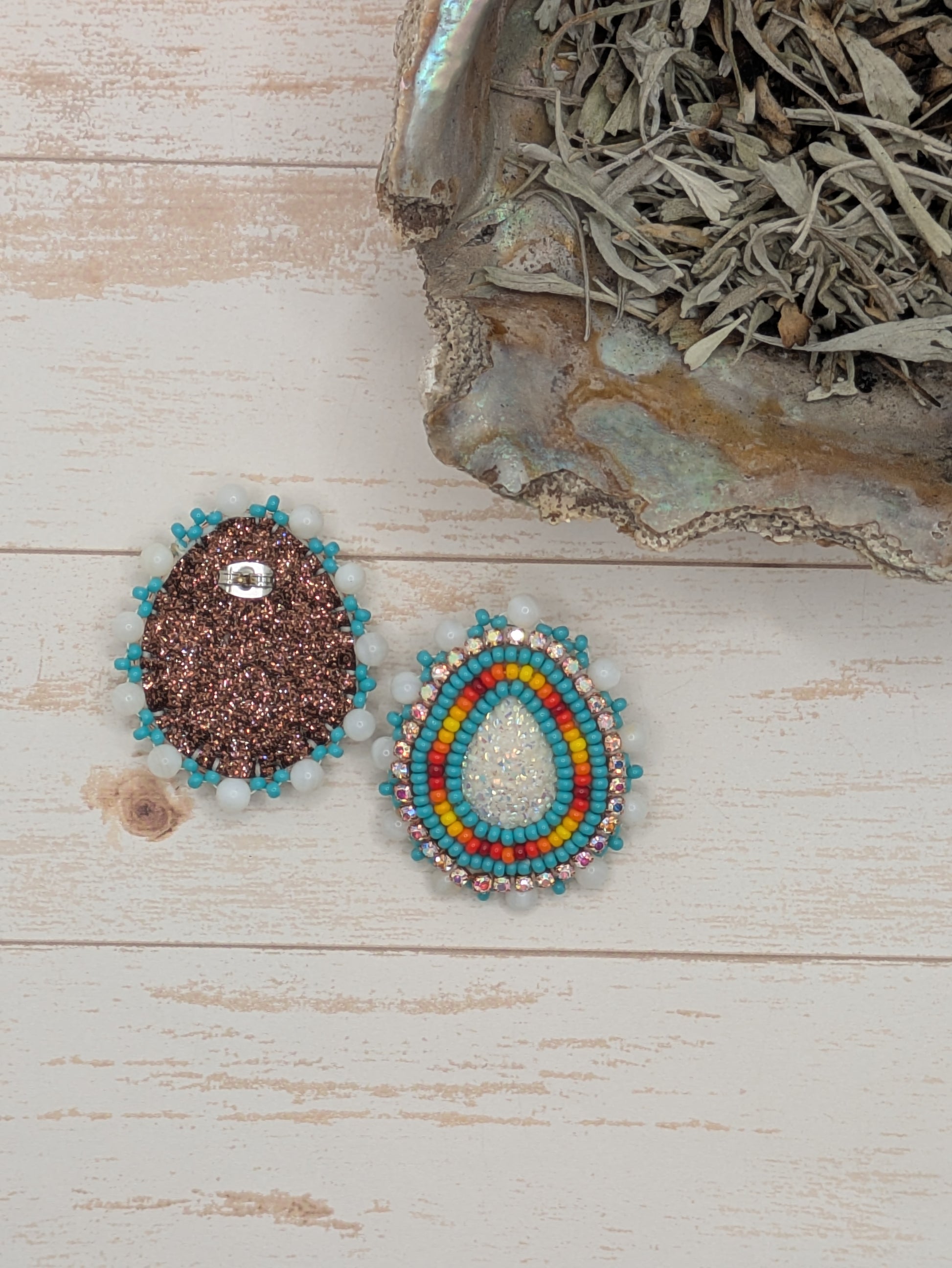 These earrings are beaded with two needle stye size 11 seed beads with rhinestone banding.